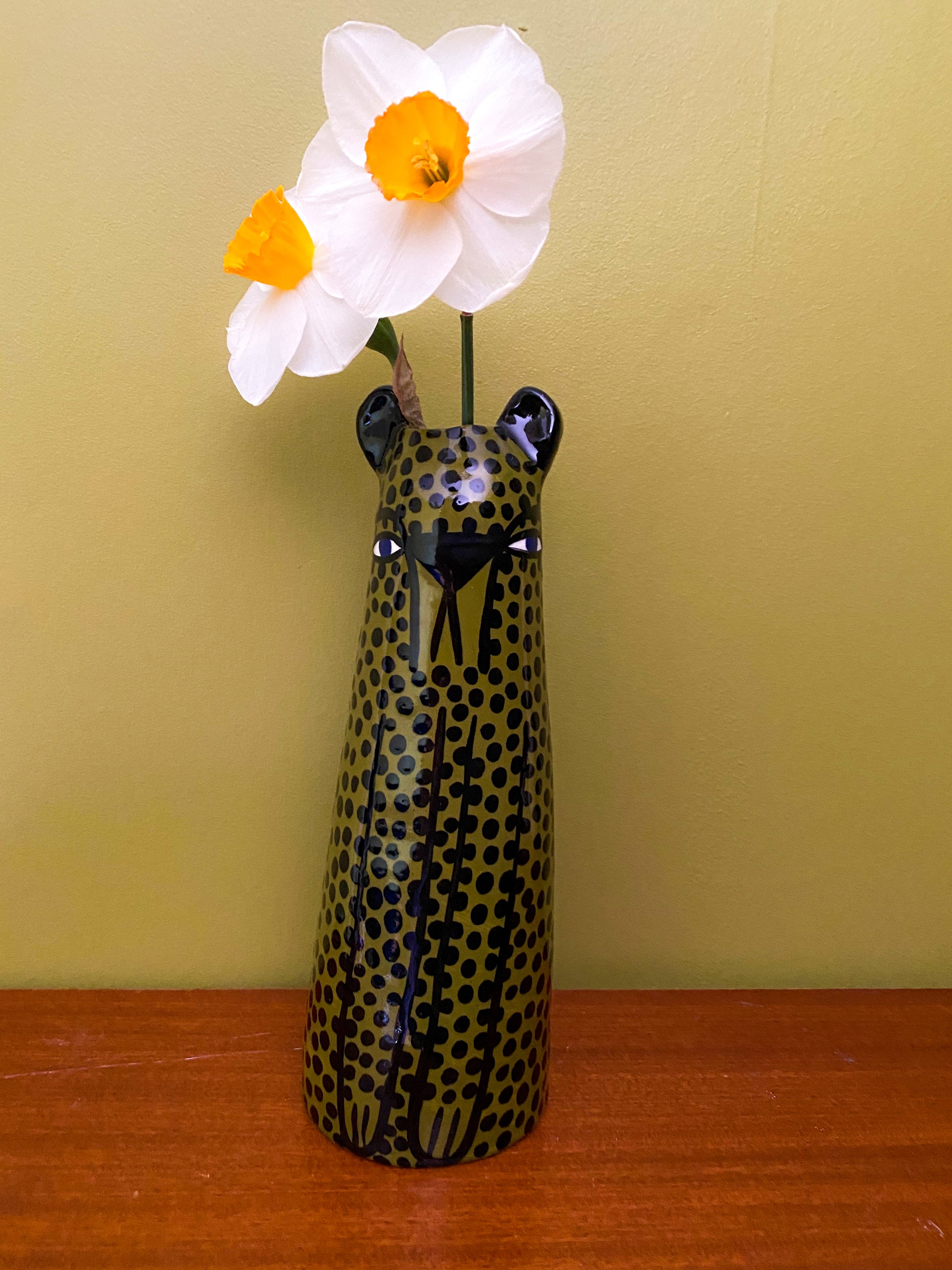 Approx 29 cm tall - diameter 10 cm. The cheetahs come in 3 different colours; yellow, pink and dark green.